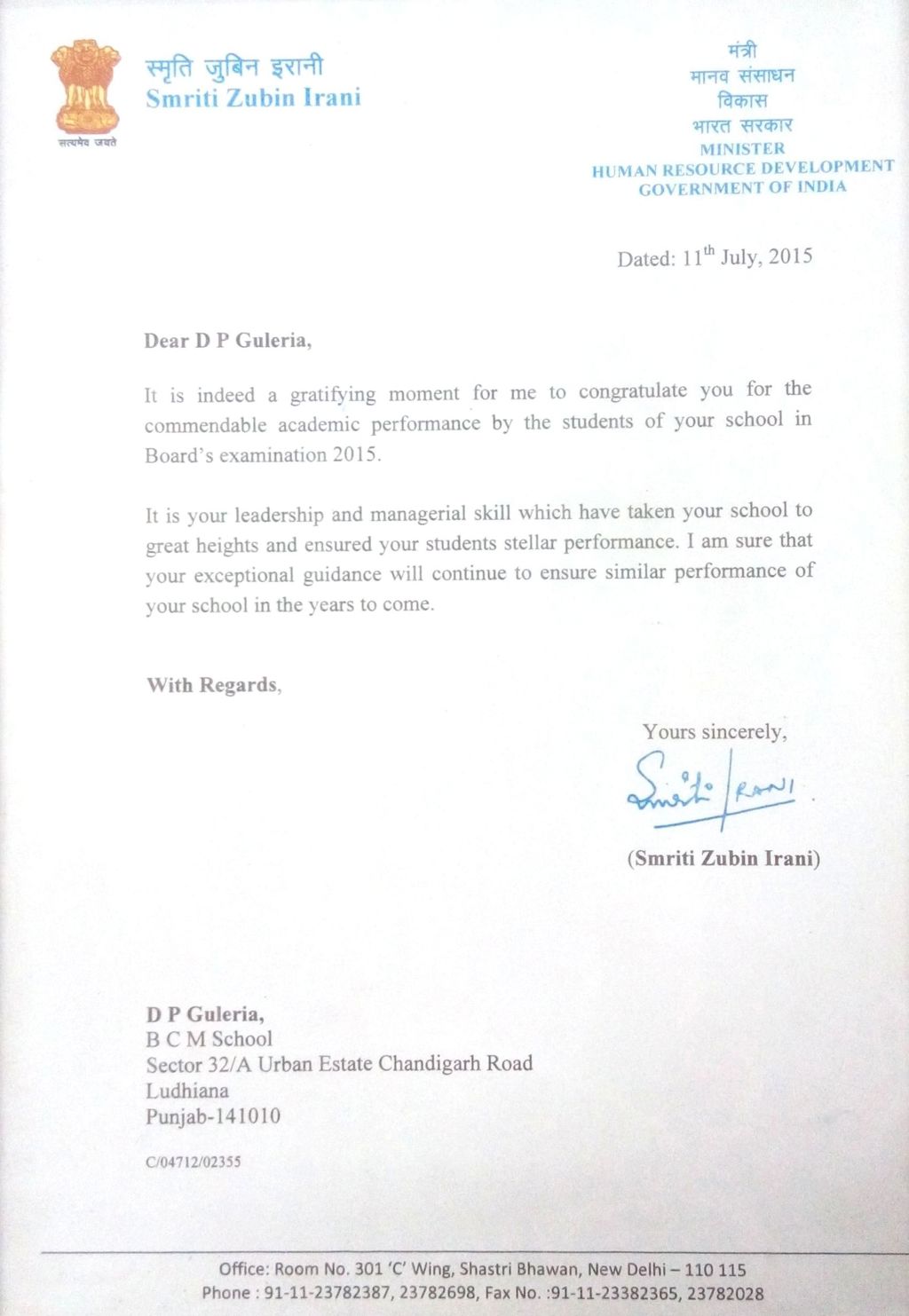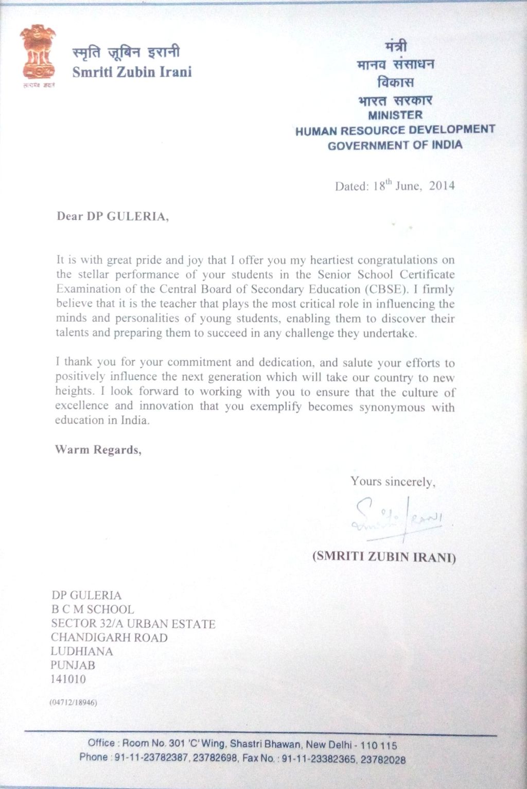 LETTER FROM HON'BLE MINISTRY OF HRD